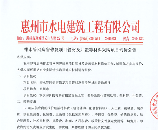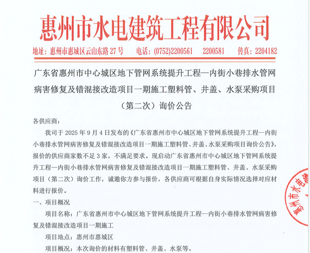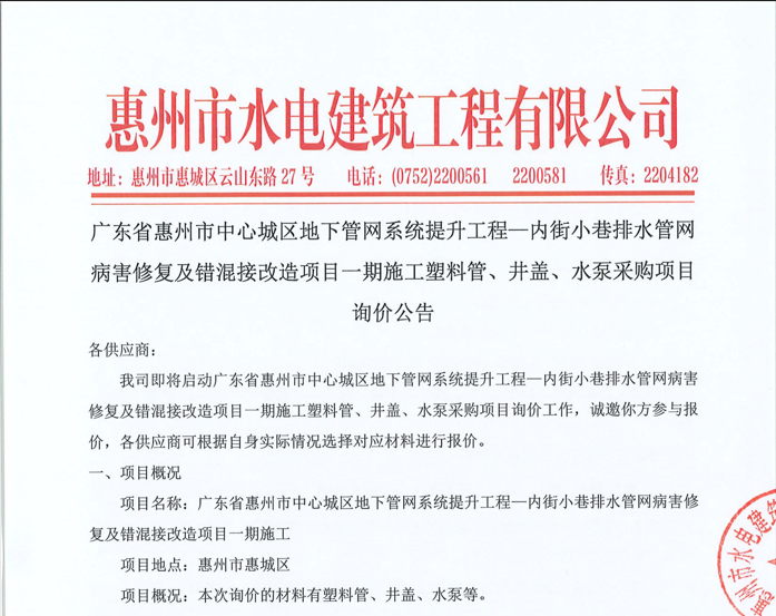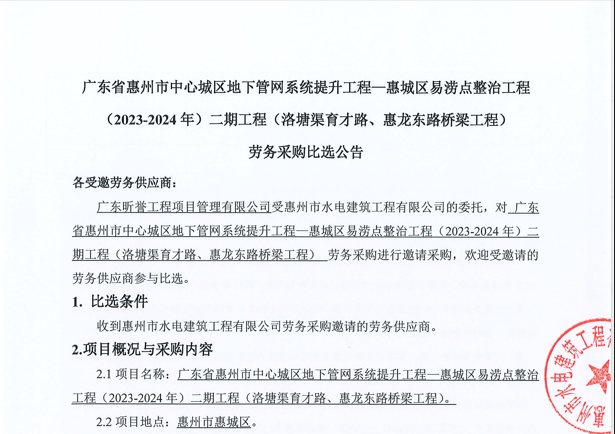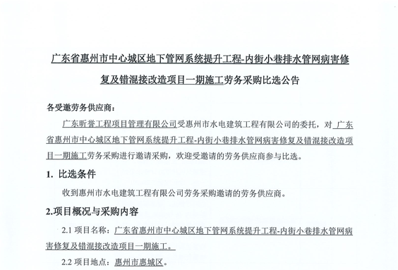 廣東省惠州市中心城區地下管網系統提升工程-內街小巷排水管網病害修復及錯混接改造項目一期施工勞務采購比選公告……